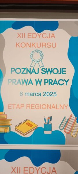 Dnia 6 marca 2025 r. uczniowie naszej szkoły po raz kolejny uczestniczyli w regionalnym etapie konkursu wiedzy o prawie pracy i BHP dla uczniów szkół ponadpodstawowych „Poznaj swoje prawa w pracy.” Była to XII edycja konkursu, który obejmuje swoim zasięgiem Białą Podlaskę, Chełm, Zamość, Lublin – miasta i powiaty.